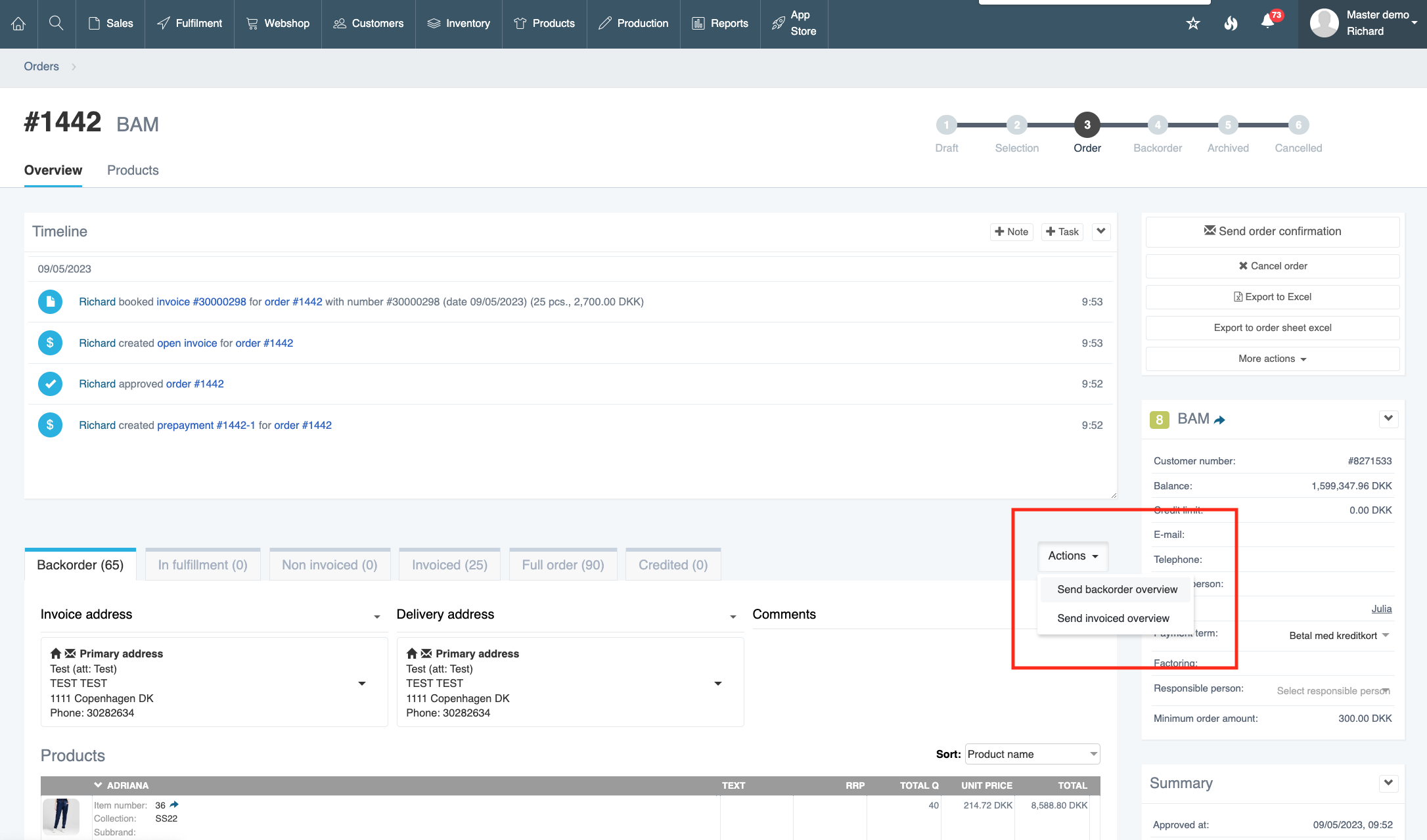 We have also created a shortcut so you can generate an overview quickly from inside an order. On the right hand side click "Actions" and select "Generate backorder overview"