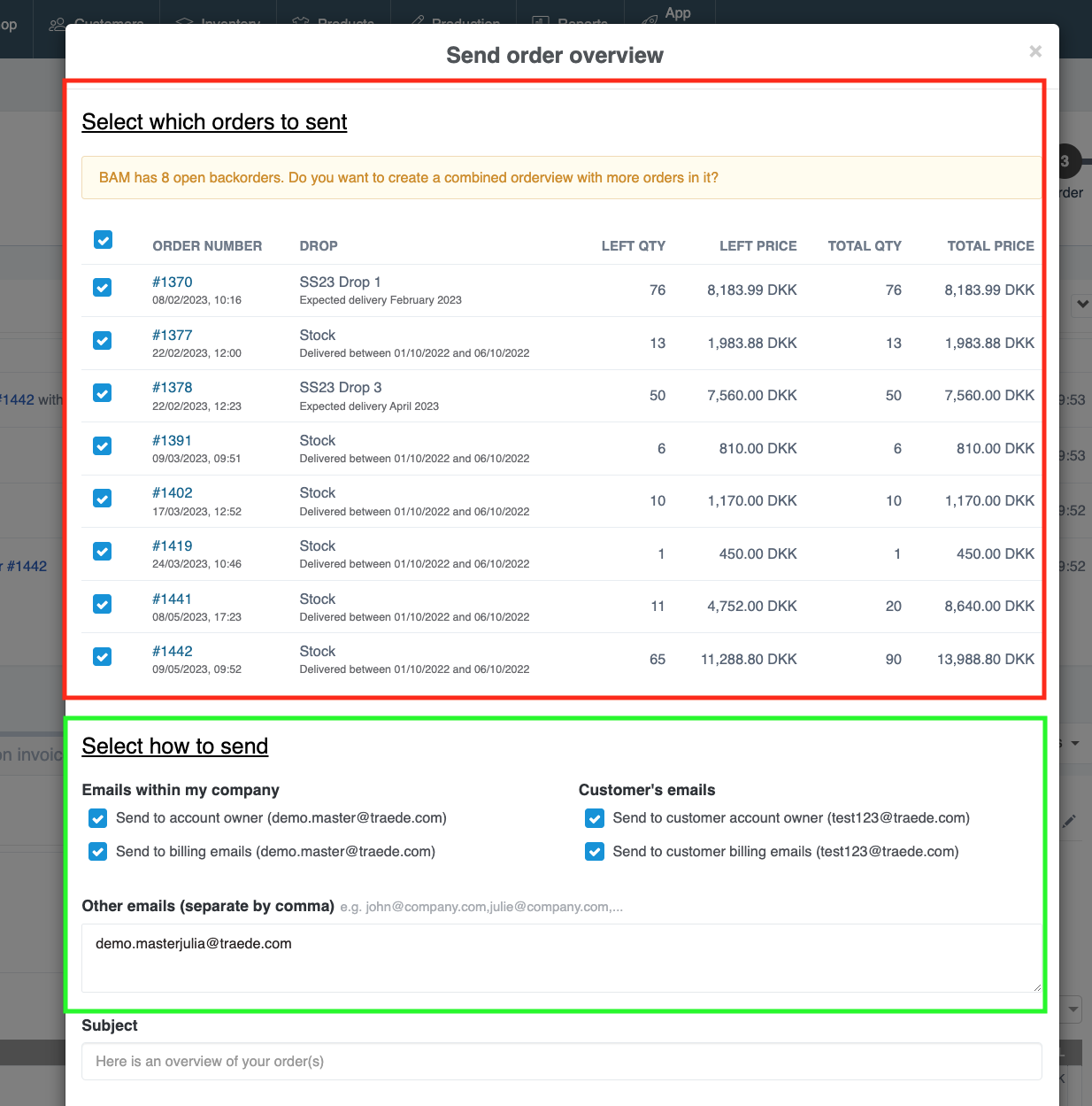 Next select which orders you wish to include in the backorder overview (red box). Finally you can customize who should receive this overview (green box)