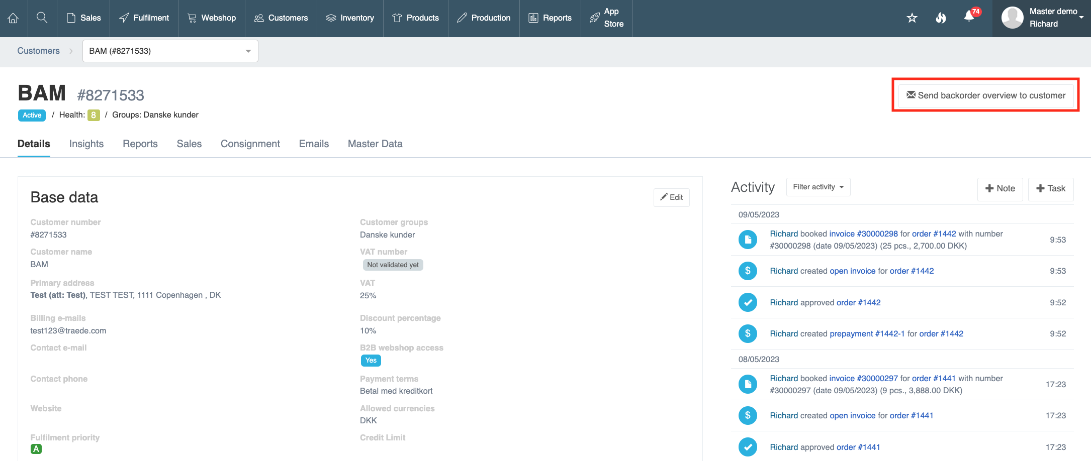 Inside the customer profile in the top right corner click the button "Send backorder overview to customer"